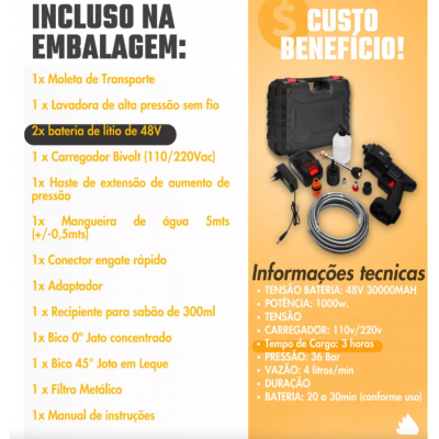 Uzoq-sterl batareyasi: taxminan 40 daqiqa batareya davomiyligi. Yuk mashinani 2 dan 3 marta yuvishi mumkin